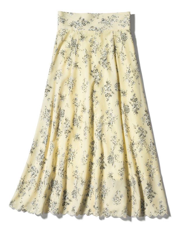 スカラップカットで仕上げた裾が乙女心を刺激♪ 控えめな小花柄ならオフィスでも浮きません。同柄のブラウスとセットアップで着るのもおすすめ。