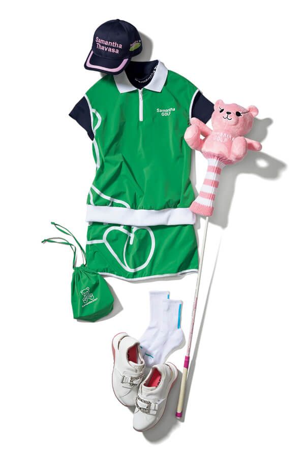 セットアップ〔5月発売予定〕¥32,780、カットソー¥17,380、キャップ¥6,380、ソックス¥3,300、ドライバーカバー¥13,200/以上Samantha GOLF(Samantha Thavasa UNDER25&No.7 新宿高島屋店) シューズ¥24,200/プラス ダイアナ(ダイアナ 原宿店)