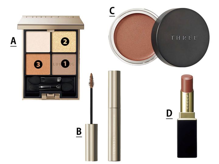 A ルナソル アイカラーレーション 22 ¥6,820、B ルナソル フェザリーアイブロウジェル 01 ¥3,300/ともにカネボウ化粧品 C グラムトーンカラーカスタード 04 ¥3,300/THREE D モイスチャー グレイズ リップスティック 01 ¥5,830(セット価格)/SUQQU