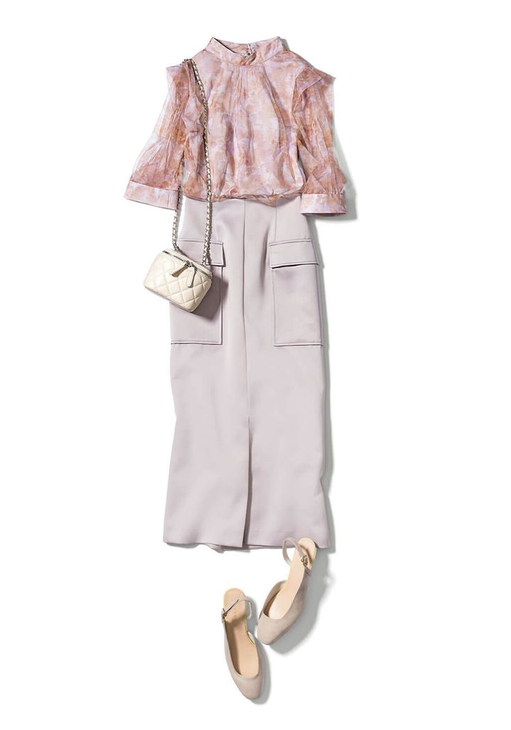 ふわりとかぶせたチュールが花柄のニュアンシーなタッチと色合いに調和して、まとう人そのものを柔和な印象に導く1着。柄を引き立てるシンプルなスカートや小物も、まろやかなベージュ系で。ワントーン風に着こなすことでも、女子会対応のトレンド感を高めて。