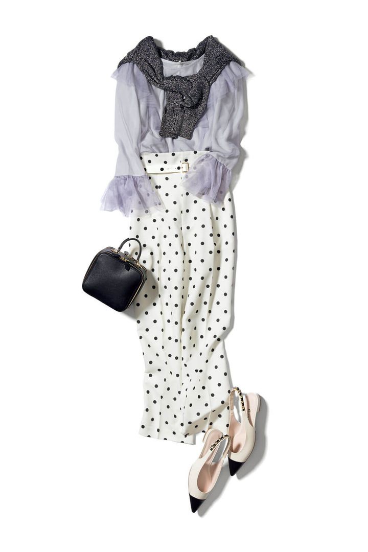 大人っぽさが漂うダスティーなパープルカラーなら、肩まわりや袖口のティアードフリルが甘すぎず取り入れやすい♪ 旬のドットスカートを合わせてクラシカルに振っても◎。