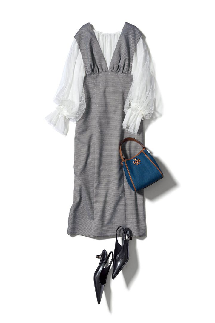 トレンド継続のジャンスカは、トップス次第でコーデの印象が激変。女子会で褒められる今っぽさを、ボリュームたっぷりのチュールブラウスで♡ 白無地なら合わせやすさも抜群です。