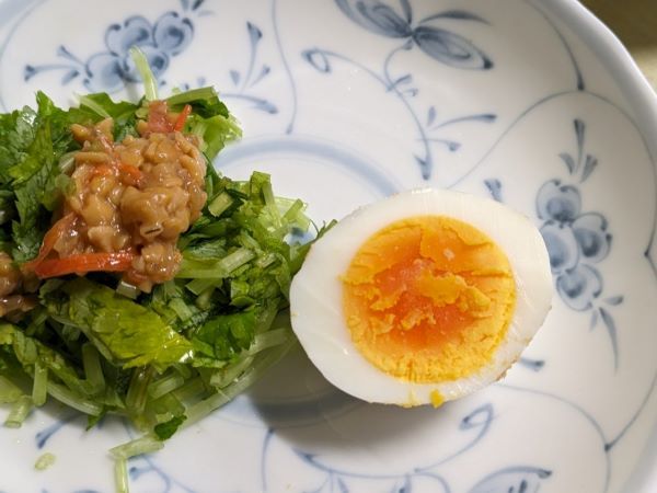 麹納豆は三つ葉に♪卵は福岡で有名な「味宝卵」が程よい半熟♪
