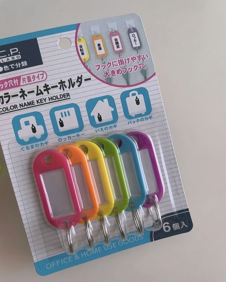 カラーネームキーホルダーだけでもいけなくはないのですが、頻繁に付け替えることを考えると、付け替えが手間・・・。
