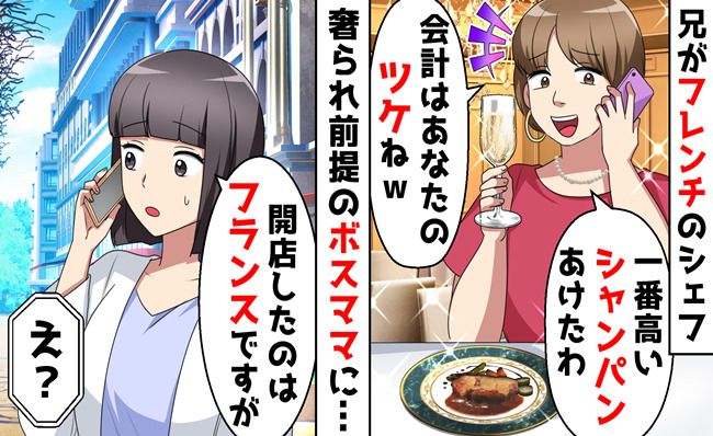 しかし、私は冷静に「兄のお店はフランスですが」と事実を伝えました。どうやら近所に新しくオープンしたお店を私の兄の店だと勘違いして豪遊していた様子。A子は「え! 私お金持ってないわよ!」と大騒ぎ!