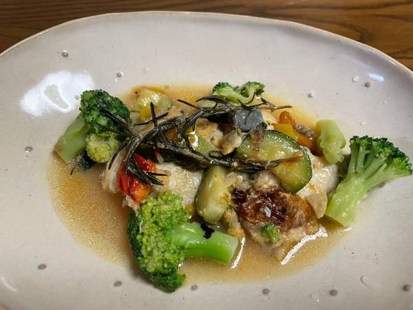 「白身魚のアクアパッツア」 お野菜と白身魚2切れが入った見た目もおしゃれなアクアパッツァのミールキット(2人分)です。調理も簡単で使用するのは油とフライパンのみ!お家にある残ったお野菜を入れてみてもいいと思います。(写真はお家にあったローズマリーを添えてみました) ご飯作りたくないなーという日のために冷凍庫にストックしておくと、気分をあげてくれそうな一品です。子供にも食べやすいお味であっという間に完食でした♪