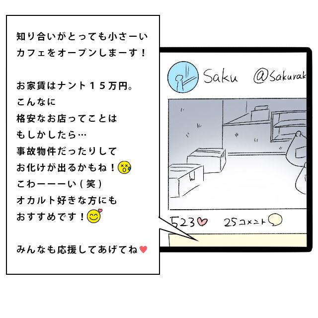「知り合いがとっても小さーいカフェをオープンします!お家賃はナント15万!こんなに格安だと事故物件だったりして・・お化け出るかもね!こわーい(笑)オカルト好きな方にもおすすめです!みんなも応援してね!」と飛んだ先は桜子のSNSでした。