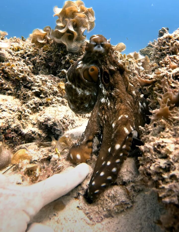 そんなモーリシャス島の海でダイビングをしていたダイバーさん。 指をさしている先には、大きなタコの姿が! おそらく、このサンゴ礁を住処や活動拠点としているのでしょう。