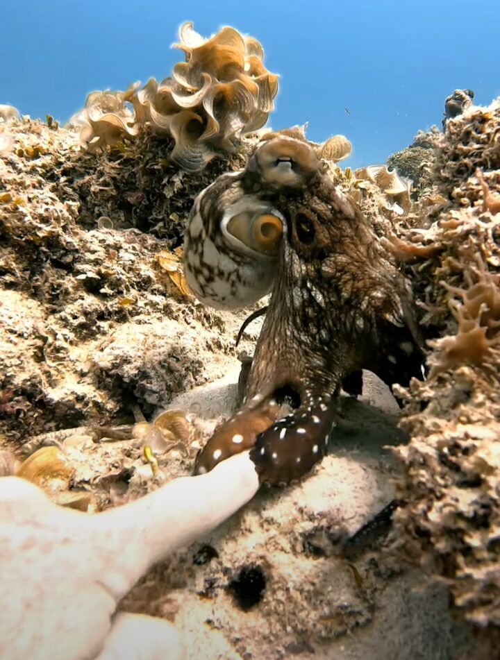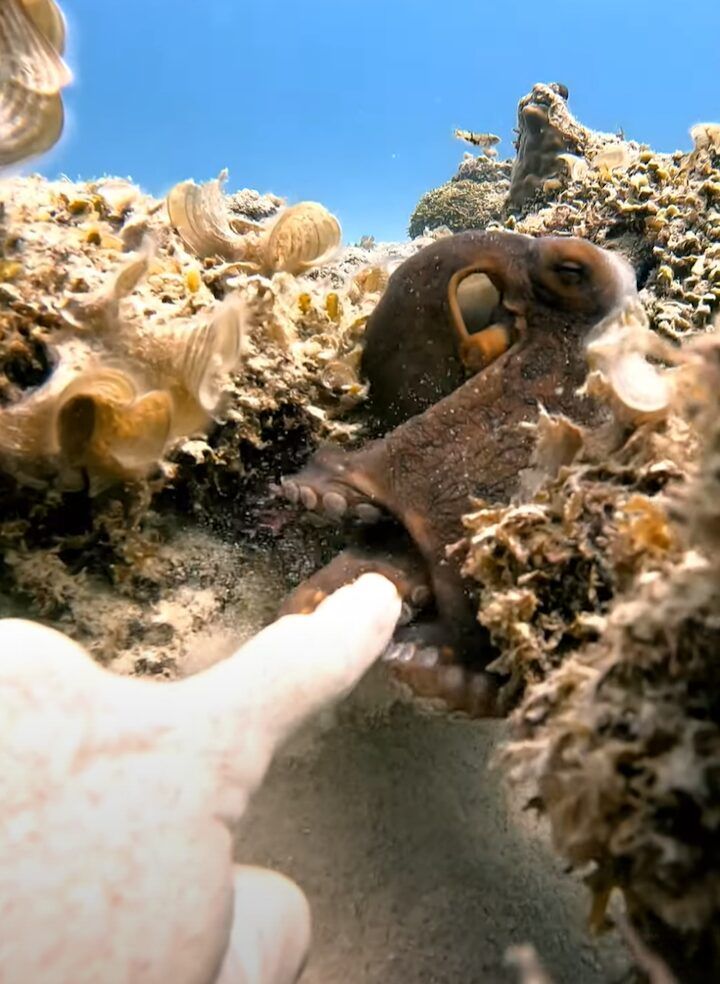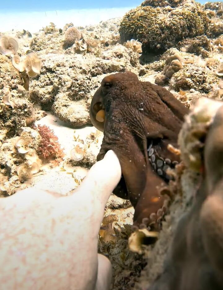 すると、このタコはダイバーさんの指に足を絡め始めました! まるで「はじめまして」の握手をしているようです。