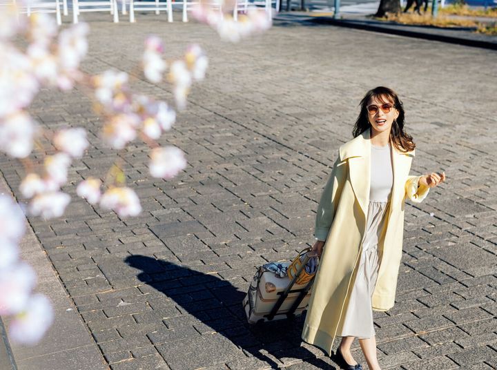 コート¥74,800 /ルル・ウィルビー(アルアバイル) ワンピース¥48,400/ANAYI バッグ¥33,000/オルセット(エストネーション グランフロント大阪店) シューズ¥33,000/プリティ・バレリーナ(F.E.N.) キャリーケース¥291,500/グローブ・トロッター(ヴァルカナイズ・ロンドン) スカーフ¥15,400/マニプリ サングラス¥16,500/ランバン オン ブルー(デリーゴジャパン) ピアス¥30,800、リング¥30,800/ともにプラウ