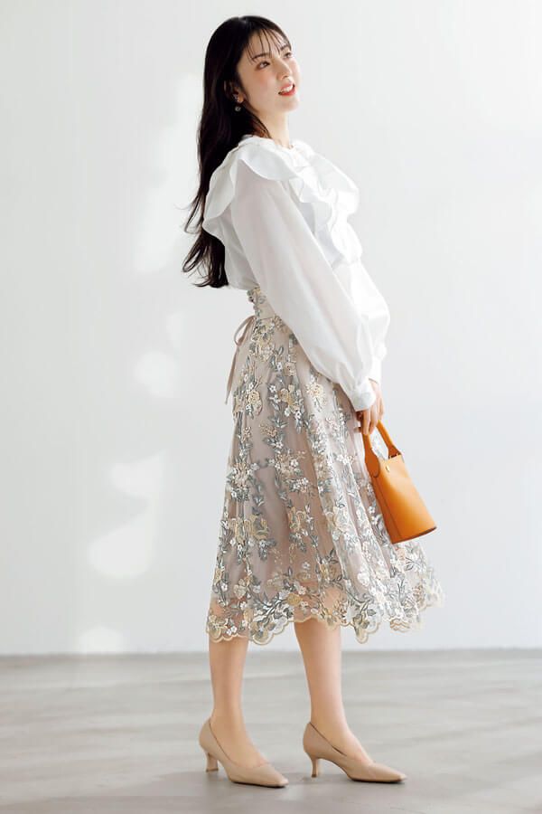 スカート¥8,690/tocco closet(tocco closet 新宿ルミネエスト店) ブラウス¥5,390/テチチ(キャン カスタマーセンター) イヤリング¥17,600/masae(ロードス) バッグ¥57,200/ロンシャン(ロンシャン・ジャパン) 靴¥30,800/銀座かねまつ(銀座かねまつ6丁目本店)