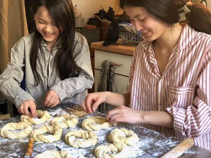 季節のお菓子作りってたのしい!とパジャマのままでワイワイやっている姉妹。