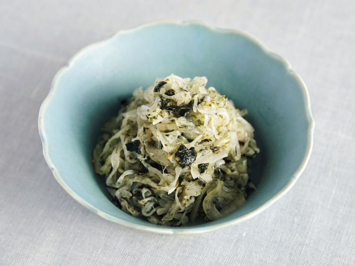 (2)玉ねぎの水けを絞ってボールに戻し入れ、ごま、細かくちぎった焼きのり、塩小さじ1/3、ごま油小さじ1を加えてさっとあえる。