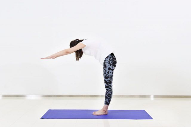 (2)合掌した手を頭上に真っ直ぐ持ち上げて手のひらを前に向け、背中を真っ直ぐにしたまま骨盤から折るイメージでお辞儀をしていき、背中が床と水平になる位置でゆっくり3呼吸(約30秒間)キープする