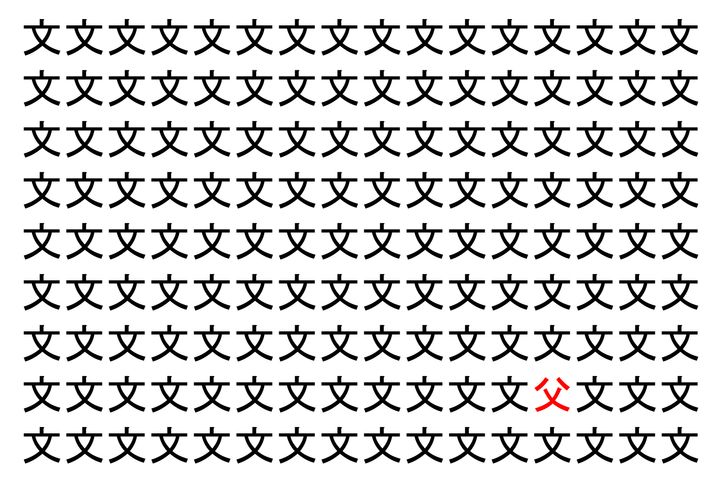 画像の中には、「文」という漢字が縦に9行、横に16個並んでいます。 全部で144個となりますが・・・、そのうち1つは「異なる漢字」となってますよ!!