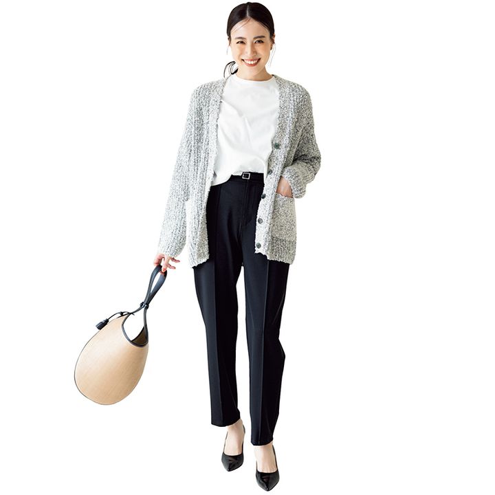 Tシャツ¥4,990(アンフィーロ)カーディガン¥49,500(プルミエ アロンディスモン)パンツ¥19,800(ユナイテッド トウキョウ/ユナイテッド トウキョウ 神宮前店)バッグ¥42,900(ヴァジック/ヴァジックジャパン)パンプス¥35,200(ピッピシック/ベイジュ)