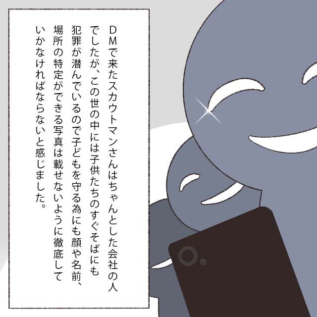 ダイレクトメールのスカウトマンさんは、ちゃんとした会社の人でしたがこの世の中には子ども達のすぐそばにも犯罪が潜んでいるので子どもを守るためにも顔や名前、場所の特定ができる写真は載せないように徹底していかなければと感じました・・・