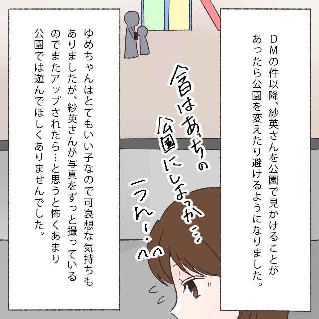 ダイレクトメッセージの件以降、ゆめちゃんママを公園で見かけると公園を変えたり、避けるようになりました。