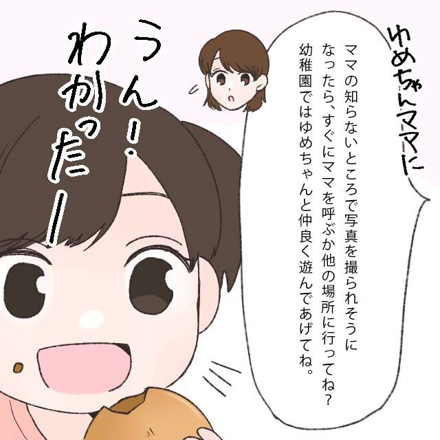 娘にはゆめちゃんママが写真を撮ってたらママに言って欲しいことと、幼稚園でゆめちゃんと沢山遊んでほしいと娘に言いました。
