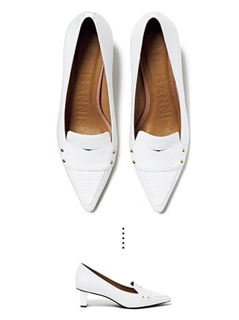 白ポインテッドローファーパンプス(4.5) 22,000円/オゥ バニスター(アバハウスインターナショナル オンラインストア) 脚をキレイに見せてくれる甲は浅めでヒールも太め。つま先は細く、全体のシルエットも細長いデザインで、日常使いにもちょうどいい5cm前後のヒール。ともすると野暮ったく見えてしまう白も、そんな鋭さのあるフォルムなら足元ももたつかず、どんなボトムにも合わせやすい。