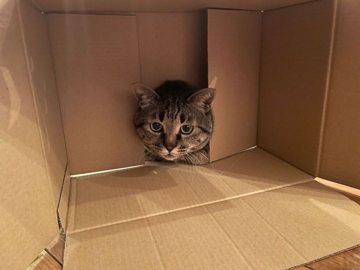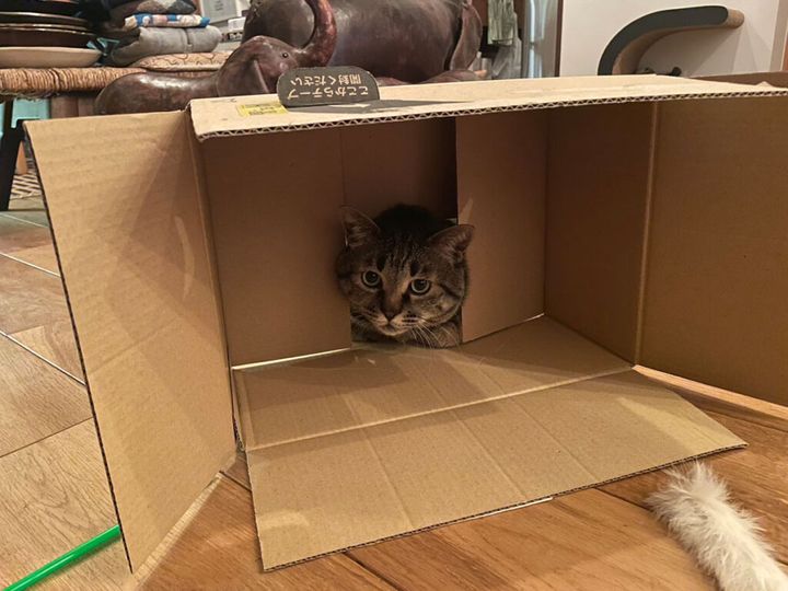 段ボールは必需品やで。叩くもよし、噛むのもよし、出たり入ったり、遊びに最高や。僕はしゃれたもんより、これが一番好きやねん。