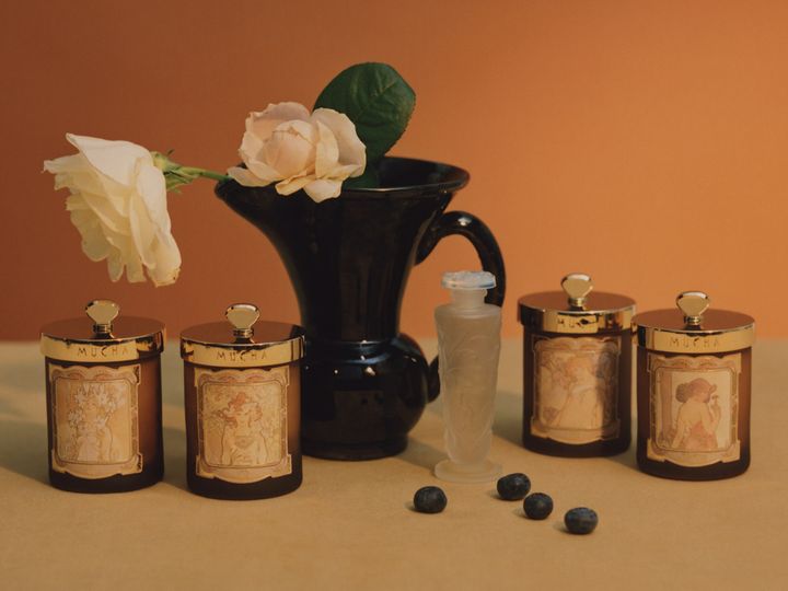 芸術家・ミュシャ財団による世界初の公認ブランド「MUCHA(ミュシャ)」では、ミュシャの四連作“The Flowers(四つの花)”をイメージした香りによるキャンドルを展開中。