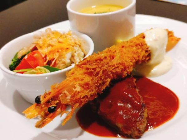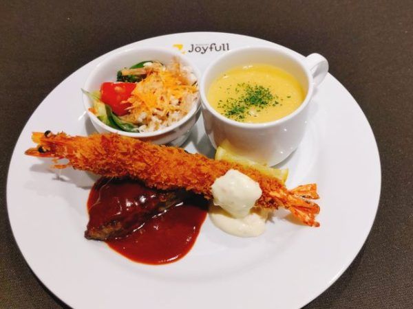 みんな大好きジョイフルのハンバーグと、秋山さんも発表会で強くオススメしていた、なんとも立派な有頭のえびを贅沢に使用。有頭の良さは、頭も尻尾も美味しく食べられるところ。1本でも食べ応えのあるぎっしり詰まったプリプリの身に大満足です。