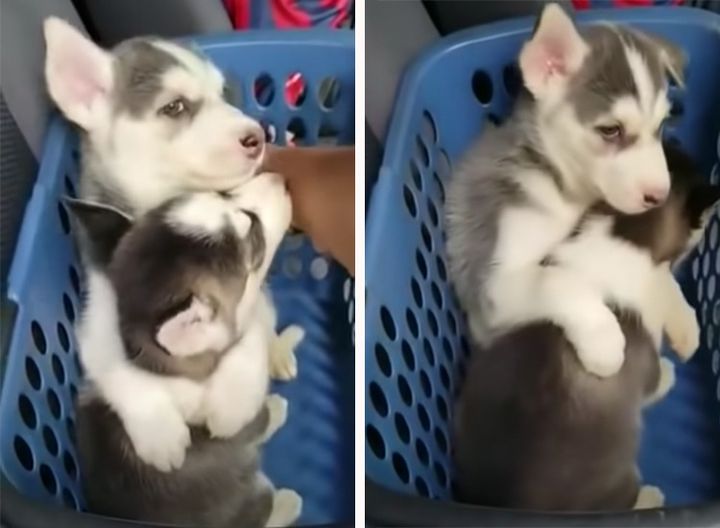 3. 「妹は渡さないから!」ぎゅっと抱きしめて守るお兄ちゃんワンコ。