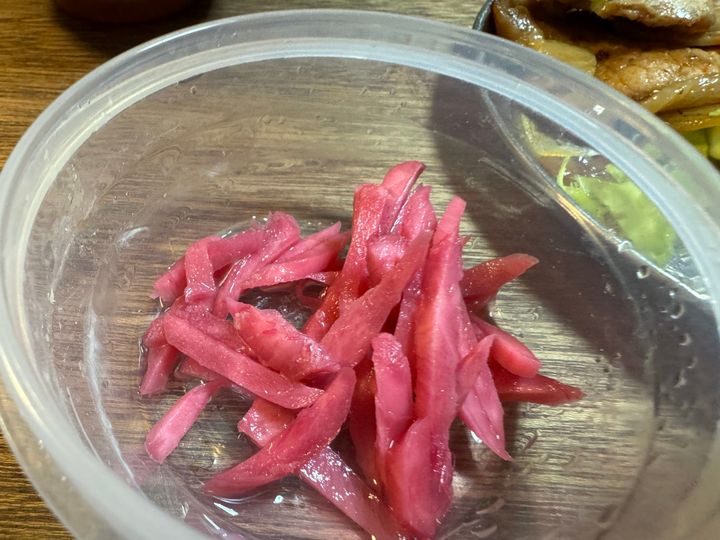 〇〇シタの新生姜ばりに赤く漬かった紅生姜。これ、めっちゃ素朴でおいしいです。牛丼や豚丼の付け合わせに最高です。おもしろいくらいに染まっていくので子どもも喜んでいました。