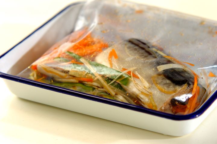 冷凍用保存袋に入れて、よく空気を抜きましょう。熱伝導の良い金属製バットに置くことで冷凍時間を短縮でき、肉の旨味もキープできます。画像は魚ですがこのような要領で。冷凍庫で2週間程度、保存可能です。