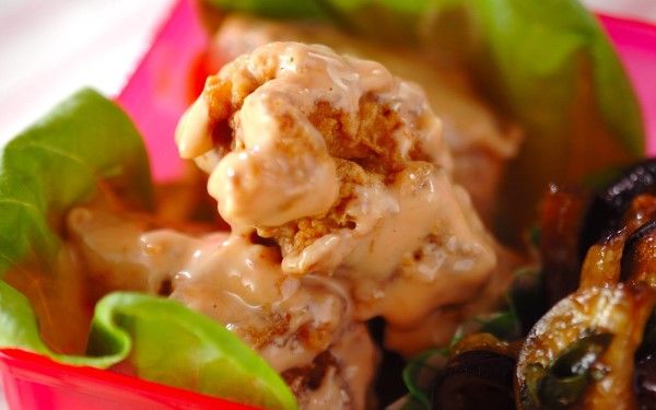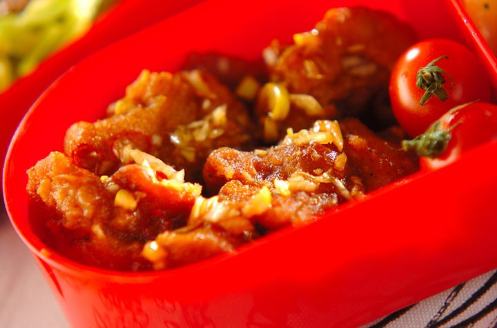 温めた冷凍唐揚げを白ネギ入りの甘酢ダレに漬けておくだけ。甘酸っぱい香味ダレが食欲をそそり、さっぱり中華風で食欲が落ちているときでも食べやすいです。暑い日のお弁当の一品としてもイチオシ。