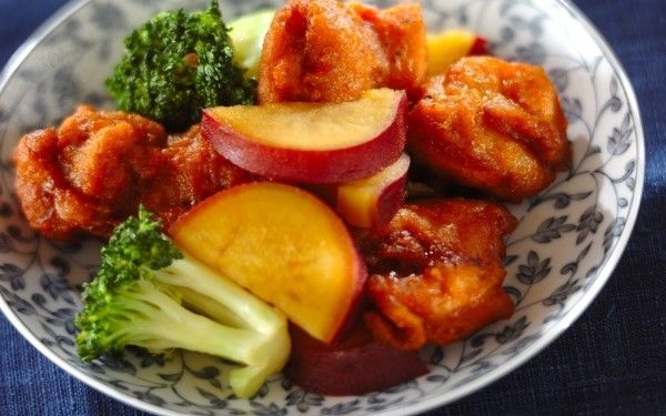 温めた冷凍唐揚げをサツマイモやブロッコリーと一緒にしょう油、メープルシロップで和えれば、立派な主菜に早変わり。甘じょっぱさがくせになり、野菜が美味しく食べられます。色合いもキレイですね。