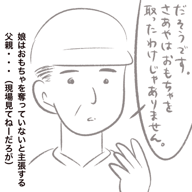 ご主人やつれさんがおーちゃんの父親に「ちゃんと娘さんをみてて下さい!」と伝えるも、「気にしなくても大丈夫ですよ」の一言。そこで、アキくんがおーちゃんにおもちゃをとられたり叩かれたりしたことも伝えると、父親の表情が変わり「おもちゃとったのか?」とおーちゃんに確認。しかし、おーちゃんが「ちがう!お手本見せてあげたんだよ!」と答えると「だそうです。とったわけじゃありません」とケロリとして言い放ち・・・。