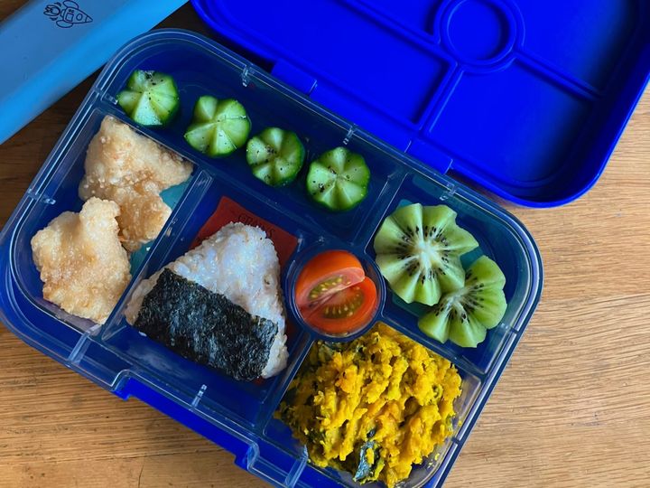 そんな檄を飛ばしながら完成させたお弁当は、詰めるだけ! 長男が小学校入学と同時に購入した「yumbox」というお弁当箱のおかげで、詰めるだけでもそれなりに完成するのがありがたいところ。
