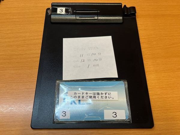 カウンターで渡されるカードキーを使って入室です。利用時間が書かれた紙もセットになっています。