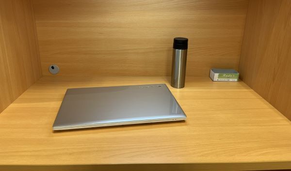 机の広さをお伝えするため、パソコン(サイズは17インチ)を持ち込みました。大きめサイズですが、それでもまだ余裕があるほどの机の広さです。また、無料Wi-Fiを利用でき各机に電源もあるため、パソコンの長時間利用の場合も安心です。