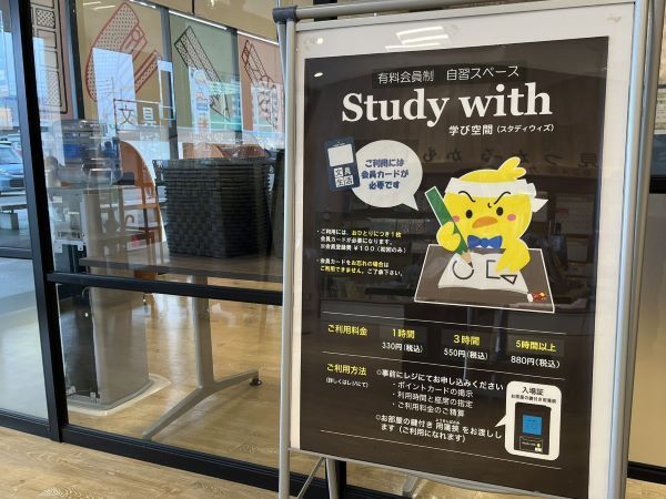 「自習室」は、店内入ると左側にありました。「Study with」とあったので学生さんの利用だけかと一瞬思ってしまいましたが、誰でも利用可能とのこと。平日はお仕事での利用や、休日や試験前などには学生の利用が多いそうです。