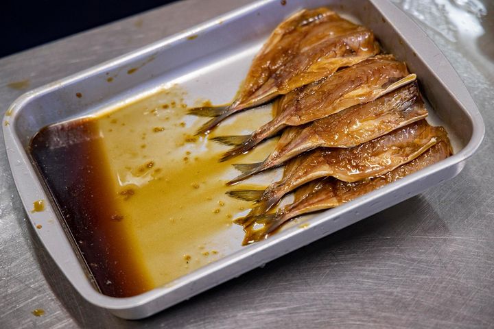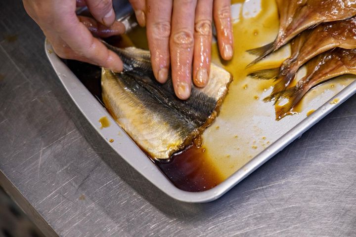 内田さんはすかさず改善策を提案してくれる。その手があったか!と言いたくなるが、隠し包丁を入れる手間をかけるぐらいならば背骨は除去したほうが食べやすい。頭と背骨を取り除いて、魚の表面が浸けダレに触れる面積を大きくすること。これが美味しいみりん干しをつくる最大の秘訣なのだ。