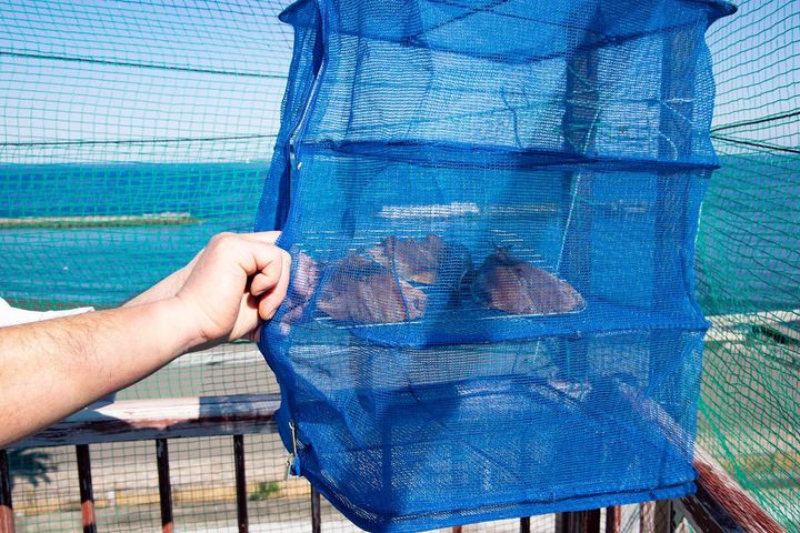 干し方は塩干しと基本的には同じ。タレがべとつくので網にのせてから干したほうが扱いやすい。身の表面を指で触ってもベタベタせず、指紋がうっすらとつくようになったら干し上がりが近い。身が締まって弾力が出て、押しても指紋が残らなくなったら完成だ。早速、焼いて食べたい!