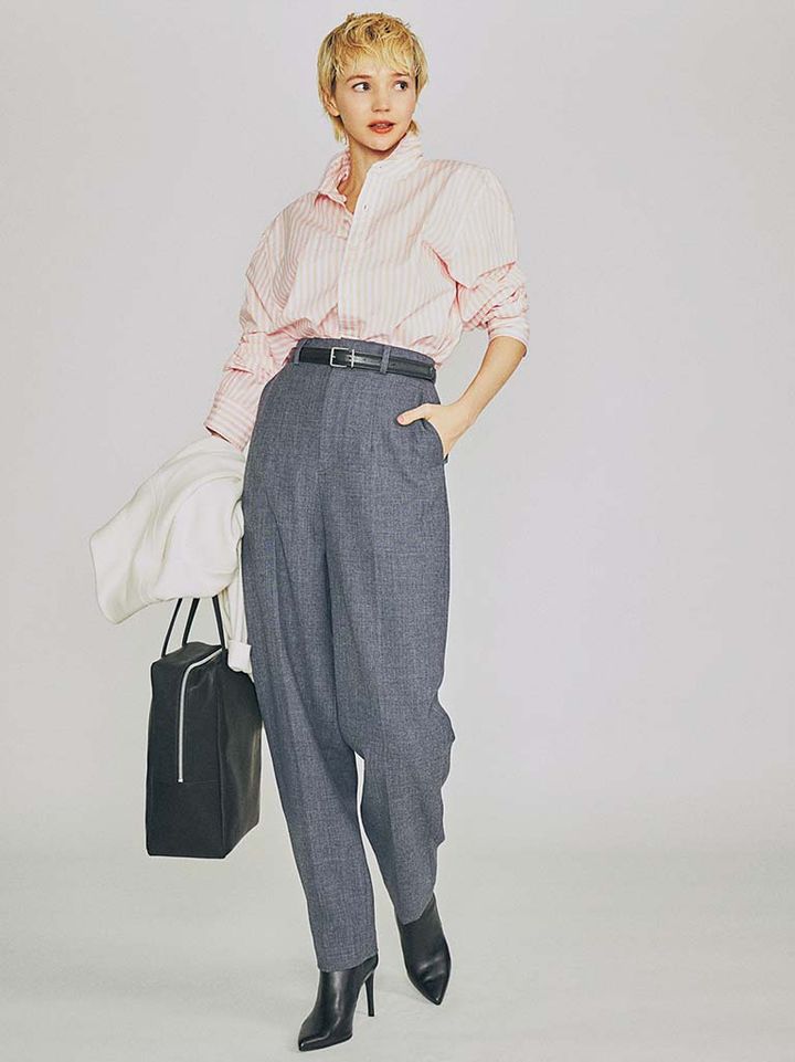 フォーマルなチャコールグレーを女性らしいカーヴィーシルエットにアレンジ。太ももまわりのハリ感が気にならず、すらりとした脚線を演出。きちんと感のあるストライプシャツやショートブーツも淡ピンクやピンヒールで選べば、かたくるしさのないマニッシュな雰囲気へ昇華。