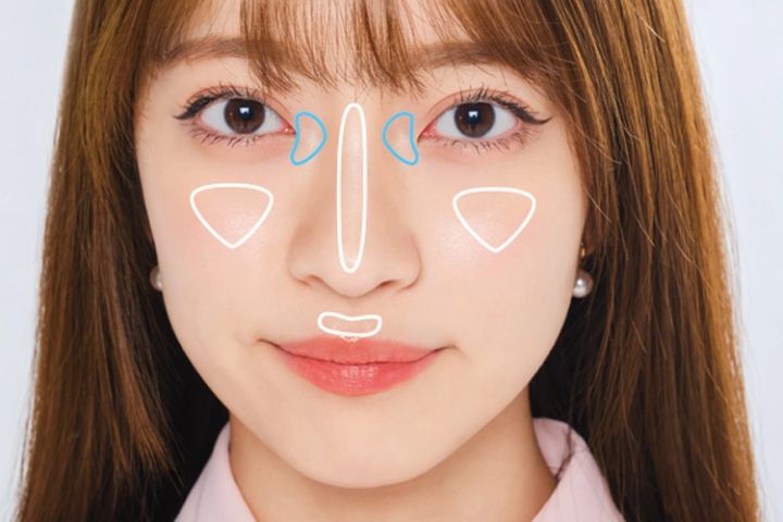 【3】さらにを青囲みの位置にものせる。顔の立体感と光のツヤ感が増して、透明感アップ。