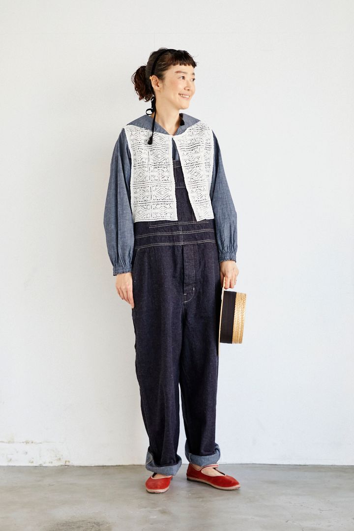 "オーバーオールが好き"と話す滝口さんの足もとは、レディライクな赤のフラット。なんでも、リップを塗るのが苦手でその代わりの意味もあるそう。