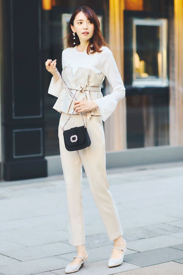 旬コーデが叶うビスチェ付きパンツは、フレア袖のニットを合わせてセットアップ風に。 センタープレスのハイウエストパンツでスタイルアップ効果抜群。パンツを女らしく着こなすには「バッグは小さめ」が鉄則。ニュアンストーンコーデには黒のミニバッグでアクセントを!