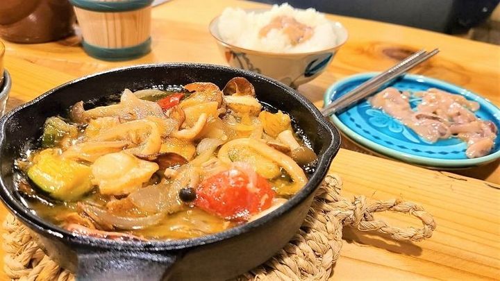 老舗が生み出す、伝統商品「イカ塩辛」を、他にも、カマンベールチーズやパスタ、パエリアと組み合わせるメニューもあります。
