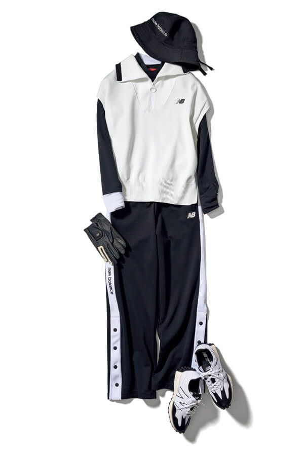 ニットベスト¥14,300、カットソー¥11,000、パンツ¥15,400、ハット¥5,940、グローブ¥5,500/以上ニューバランス(TSI ニューバランスゴルフ セクション) スパイク オープン価格/ニューバランス(ニューバランス ジャパン)