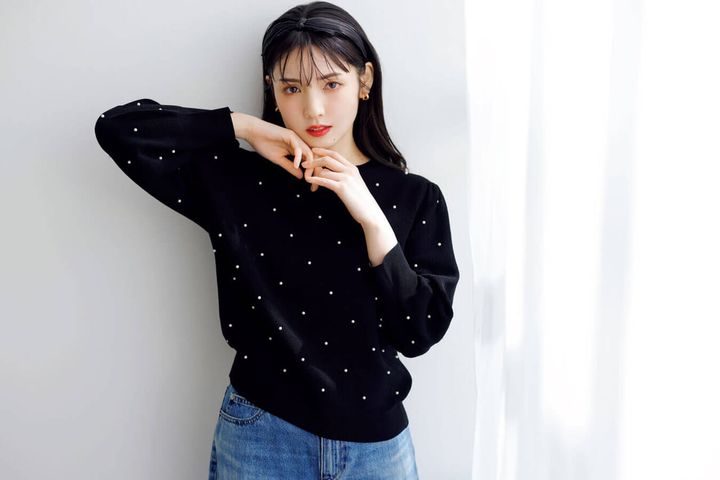 1枚で着映えるのはちりばめたパールのおかげ♡ ニットに添えたパールが大粒すぎないので、華やかさがありながらもエレガントなムード。フェミニンスカートと合わせるだけでなく、デニムパンツでカジュアルダウンして今っぽく着こなすのもおすすめ。