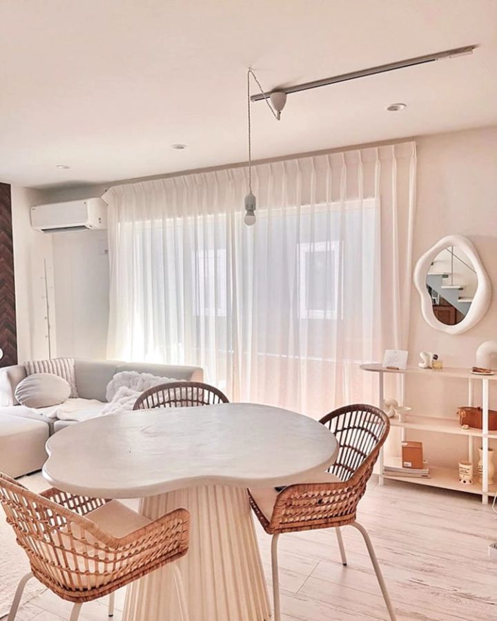曲線の家具って日本にはまだ少ないですが、取り入れると異空間のよう。テーブルもミラーもnuruで購入しました。