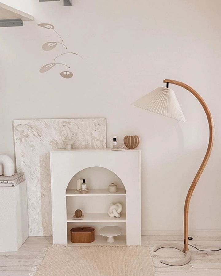 曲線がおしゃれなフロアスタンドライトは楽天ルームで2万8800円。マントルピースは、なんと自分でDIYしました♡
