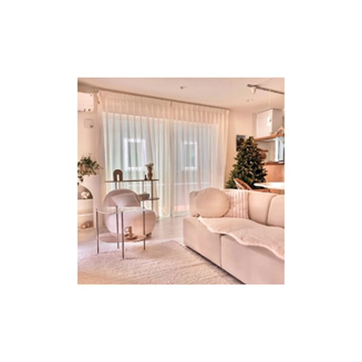 ホワイトメインのリビングですが、異素材をあわせて空間づくりをしています。ネットでの買い物が多く、韓国のセレクトショップ、楽天、H&Mホームをよく利用しています。