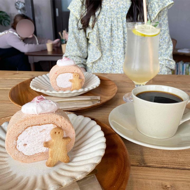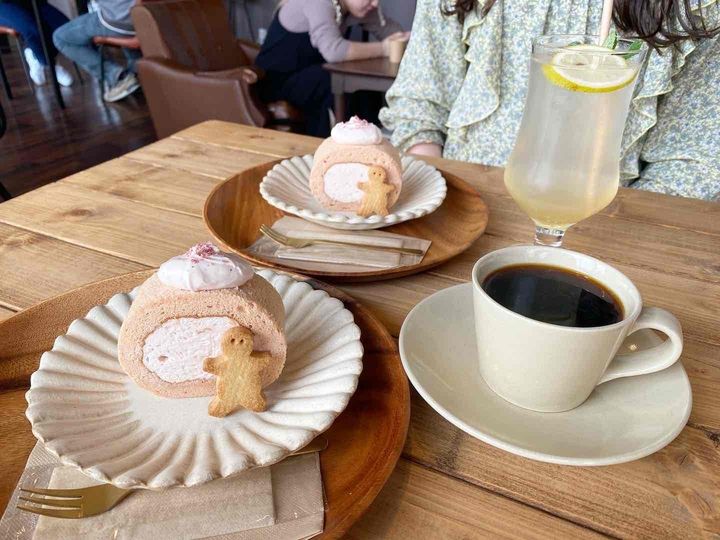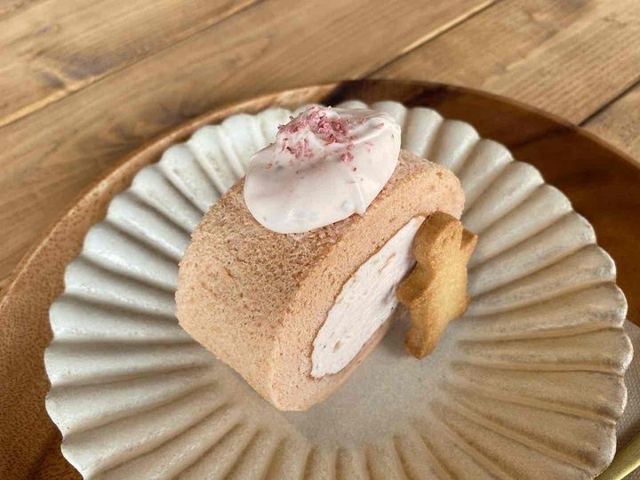 春シーズンの期間限定で提供されている「米粉のシフォンロールケーキ」700円(以降すべて税込)は、厚みのあるピンクのロールケーキにぽてっとトッピングされた桜のクリームが多幸感たっぷりのスイーツ。ジンジャーマンのようなクッキーもキャッチーでかわいいです♡